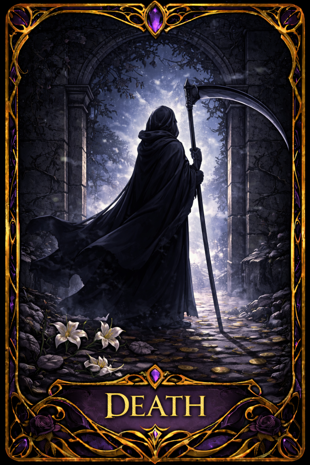 Things do end. Sometimes slowly, gradually flowing into one another. Other times suddenly and sharply. This card means the latter. At times a death brings immense relief, at others grief may last for years. But the essence of this card is you: your fear, your mourning, or the extremes of your own ability to transform. Most often, it simply signifies a new beginning. From the beginning to the end — and then again.