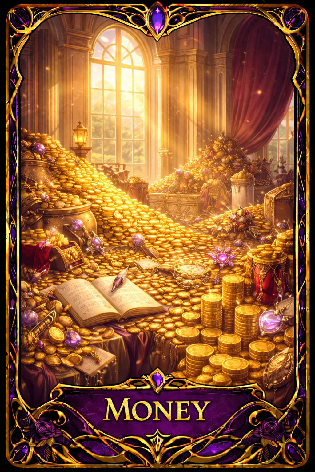 This is the big money card, symbolizing abundance, but also disorder. It may be a sign to bring order to your financial life and deal with material matters you have been postponing. It can indicate wealth growth or financial loss depending on context. Solar energy is associated with this card.