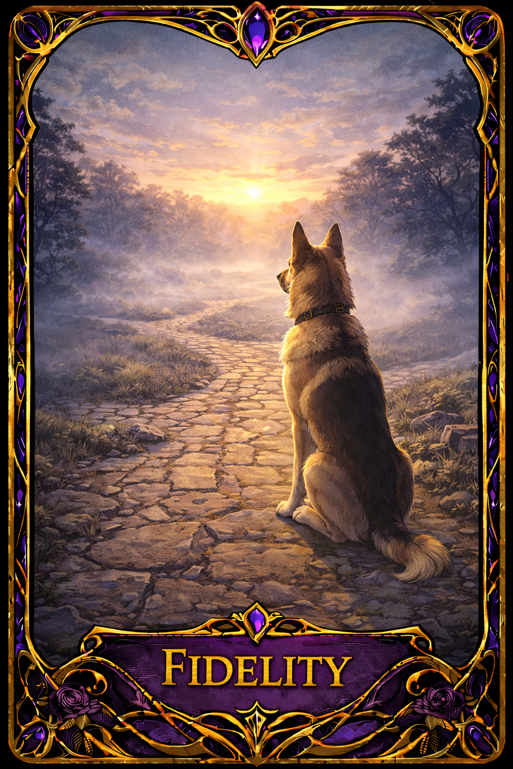 The card shows a dog, symbol of loyalty and service. It asks an important question: are you loyal out of fear of change, serving your current condition, or are you loyal to your true existence and purpose, through which you fulfill yourself? On a lower level, fidelity can mean fear of change. On a higher level, it means conscious humility and devotion.